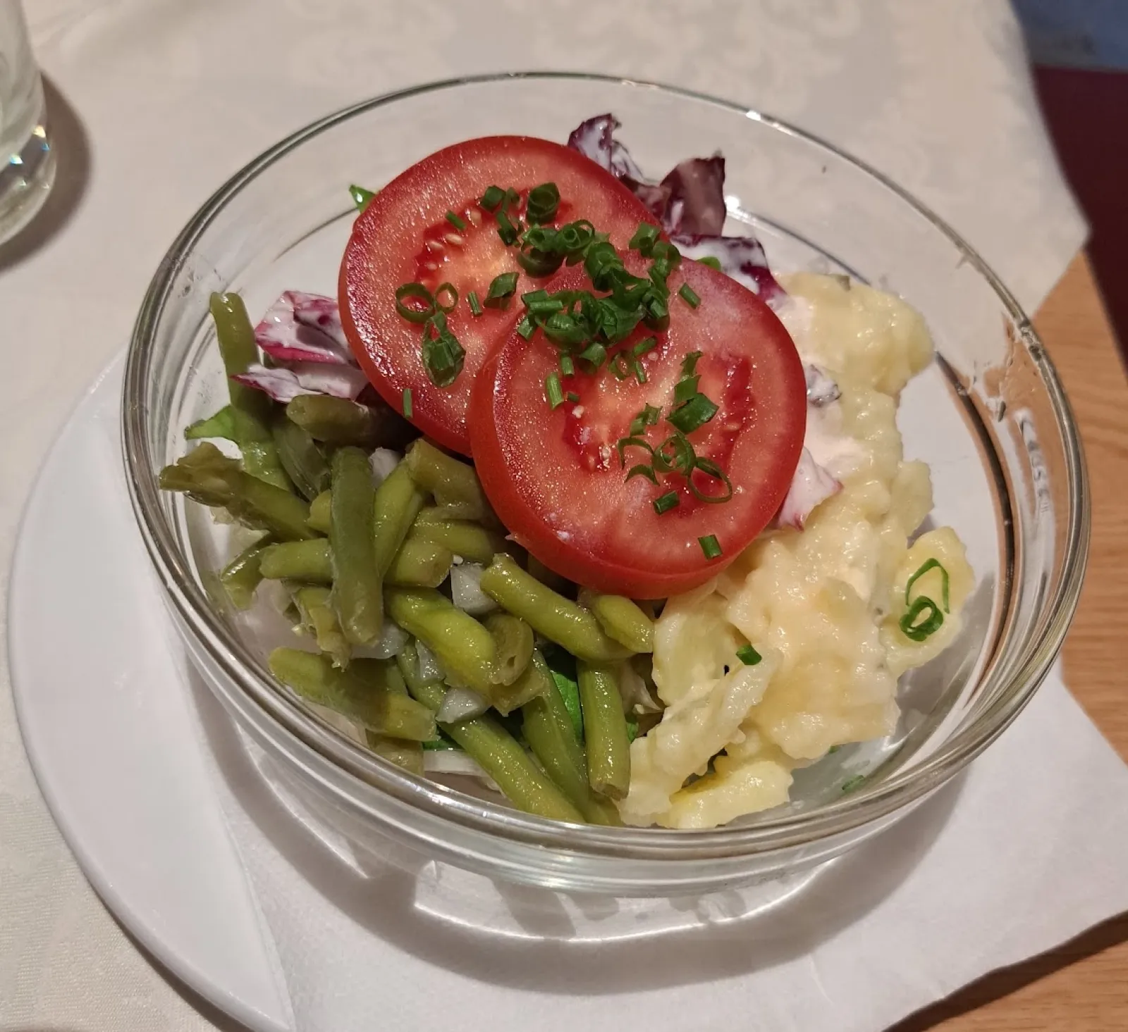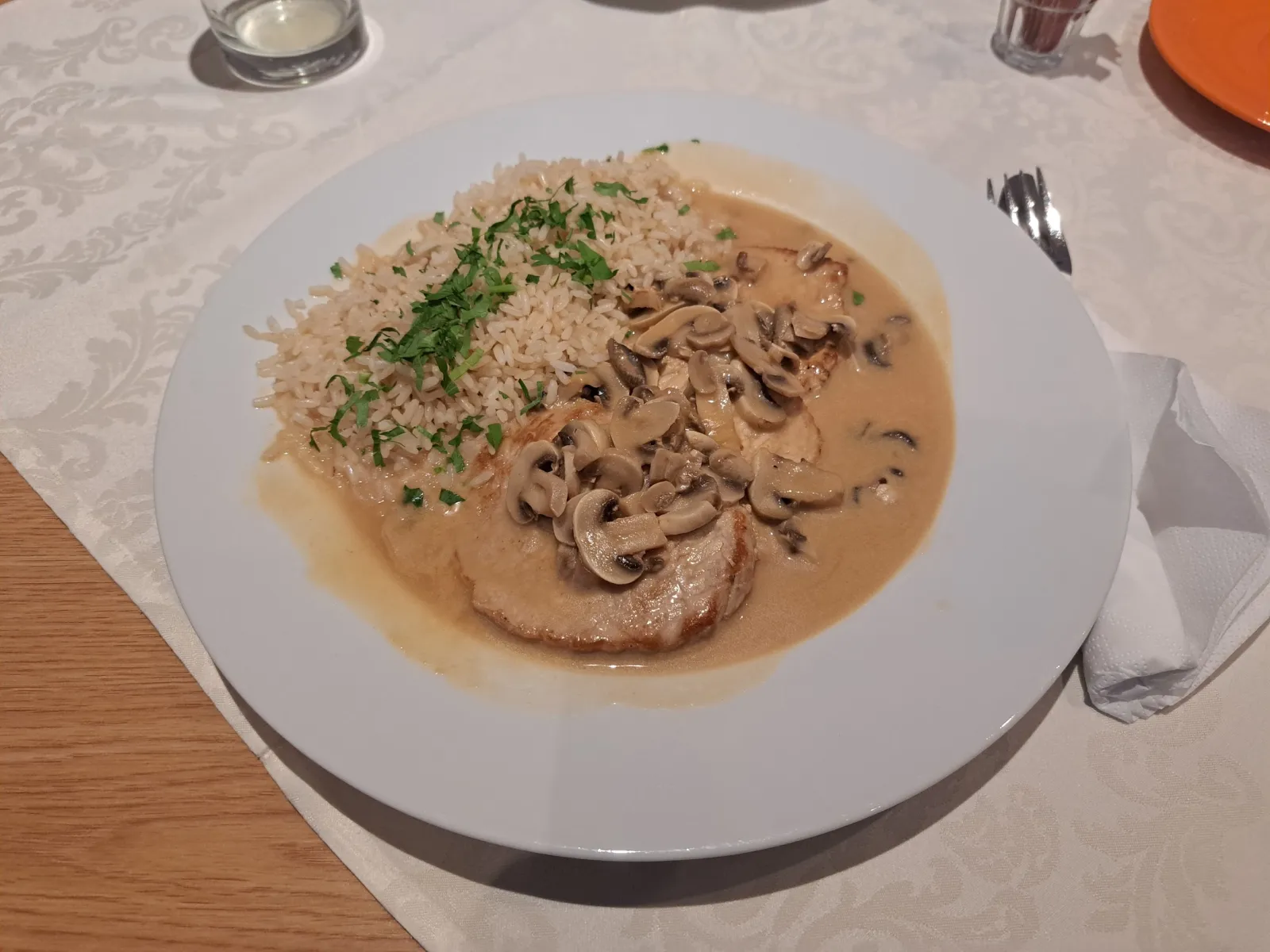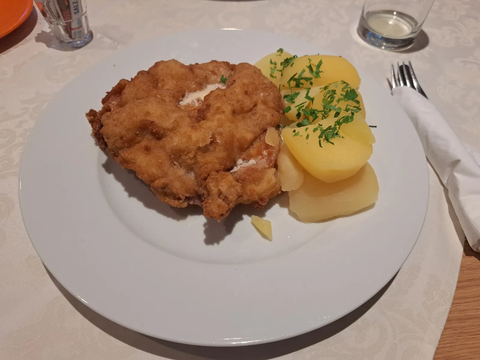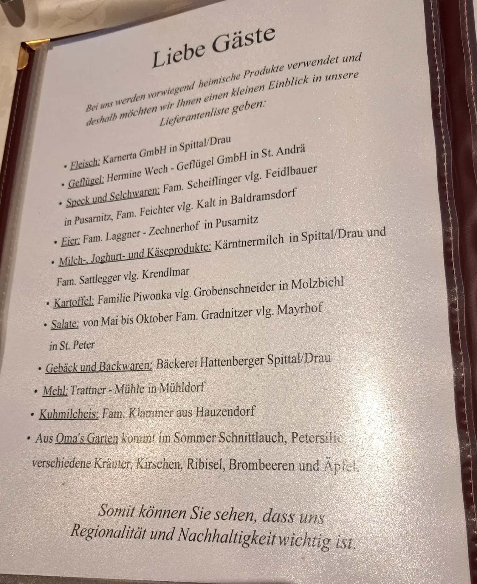 Das kulinarische Angebot besteht aus österreichischen Gerichten, die großzügig portioniert und mit einem guten Preis-Leistungs-Verhältnis serviert werden. Unsere Wahl fiel auf weniger traditionelle, aber interessante Varianten wie Schnitzel mit Champignonsauce und ein Cordon Bleu. Die Speisekarte verfügt auch über eine eigene Seite, die sich der Herkunft der Zutaten widmet. Obwohl regionale Produkte verwendet werden, könnte an mancher Stelle die Frische und Präsentation verbessert werden. Beispielsweise kamen die Champignons geschmacklich nicht an das Niveau frischer Pilze heran, und die Schnitzel waren zwar reichlich, aber unspektakulär präsentiert.